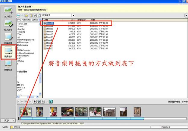 9.點按【背景音樂】:若要加入相片背景音樂可執行此步驟,將音樂檔拖曳至下方圖片處即可,按【確定】