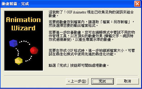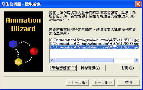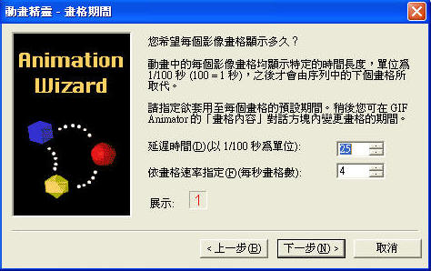 四、按下動畫精靈,執行下列五個步驟,即完成影像播放動畫。若在設定後要再使用動畫精靈,則在檔案/動畫精靈啟動。